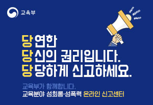 TECH UNIVERSITY OF KOREA 한국공학대학교 인권센터는 구성원의 인권을 보호하고 권익을 향상시키며 구성원이 서로 존중받는 공동체를 만들기 위해 2020년 5월 신설되었습니다. 인권침해 사안에 대한 신고 접수와 상담을 진행하고 있으며, 상담 신청은 방문/전화/이메일을 통해 가능합니다. - 인권센터/ 제2생활관 201호/ 031-8041-1551/ humanright@tukorea.ac.kr 인권센터(성희롱 성폭력상담실)에서는 대학 구성원(교원,직원,학생)산기인 모두가 성에 대해 성숙하고 건강한 시각과 태도를 가지고 함께 조화롭고 자유로운 환경에서 학습하고 일할 수 있도록 돕고 있습니다. 인권센터(성희롱 성폭력상담실)에서는 성폭력, 성희롱, 성매매, 가정폭력에 관한 예방교육 및 홍보를 통해 구성원들의 양성평등의식을 높이고 문제를 예방하고자 하며, 그 밖에도 피해자가 피해를 극복하는데 필요한 지원을 하기 위해서 노력하고 있습니다. ※ 오른쪽 배너를 누르면 성희롱 성폭력 온라인 신고센터로 이동합니다.