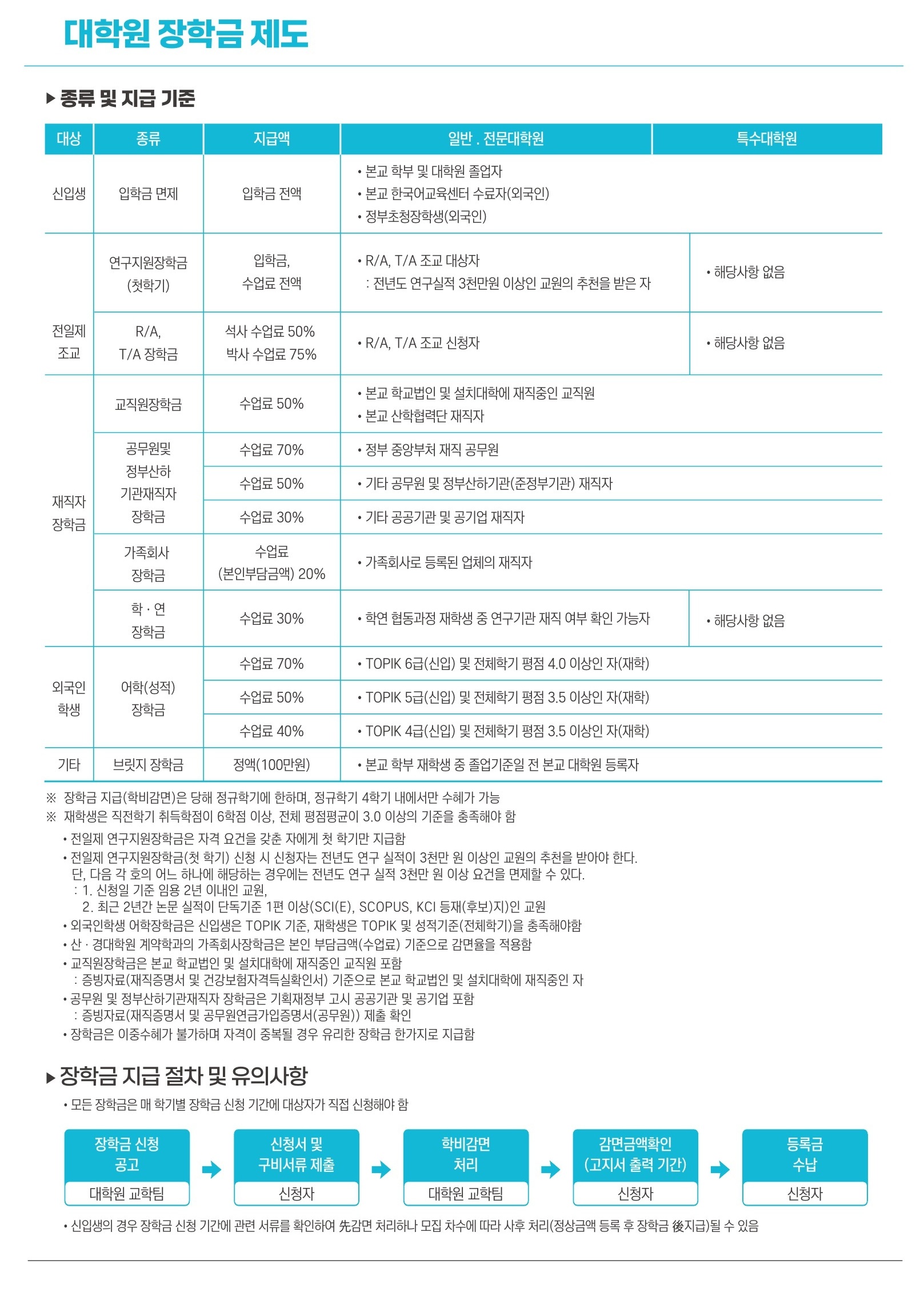 신청기간 신입생, 복학생(입학시, 복학시), 재학생(학기말/6월,12월) 지정기간 제출서류 조교장학금 : 조교신청서, 조교복무협약서, 건강보험자격득실확인서 각 1부 재직자장학금 : 장학금신청서, 재직증명서 각 1부